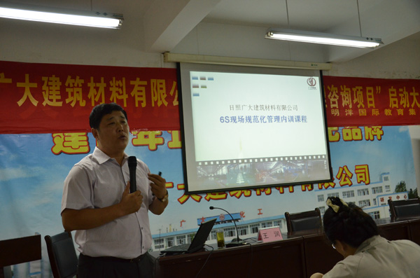2015年7月14日,日照廣大建筑材料有限公司“6S規(guī)范化管理咨詢項目”啟動大會在研發(fā)中心大會議室隆重召開,公司董事長程永聚、副總經(jīng)理劉偉、許繡梅以及公司全體管理人員和各部門業(yè)務(wù)骨干近60人列席參會。項目啟動大會由辦公室主任王麗萍主持,明洋公司咨詢總監(jiān)王潤老師對廣大建材目前在企業(yè)管理方面尤其是生產(chǎn)管理方面存在的問題進(jìn)行簡單介紹,同時對此項目的咨詢內(nèi)容、推進(jìn)步驟、咨詢目標(biāo)、項目推進(jìn)計劃等做了詳細(xì)講解。